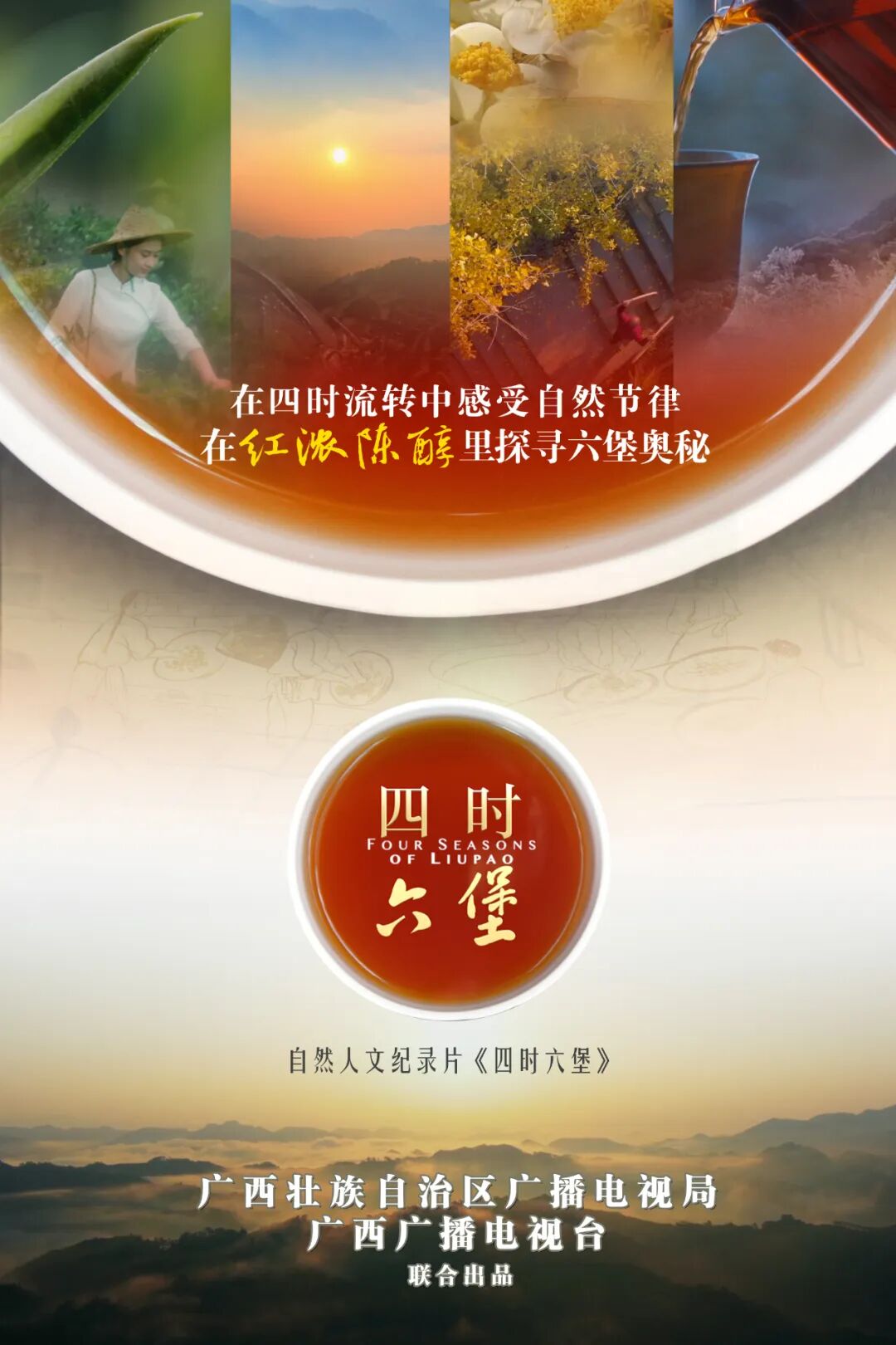 纪录片《四时六堡》以春夏秋冬四季和二十四节气为时间轴线,着眼于广西六堡茶相关的人、事、地、物,通过独特视角展现了广西六堡茶的历史文化积淀及制作工艺的当代创新,既展现了中华优秀传统文化,又生动反映了广西如何以茶为载体,生动诠释对外文化交流、乡村振兴和民族团结等时代主题。
