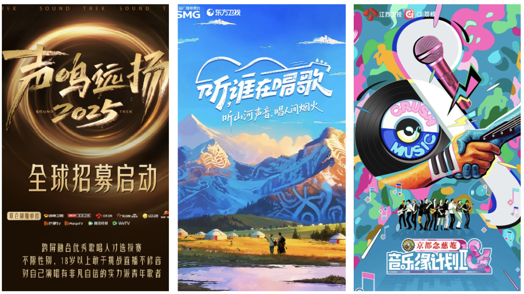 新播音乐综艺收视反响热烈,“声超”联赛《声鸣远扬2025》(湖南卫视、北京卫视、江苏卫视、广东卫视、辽宁卫视、新疆卫视、金鹰纪实)本月在7家卫视频道及芒果TV、腾讯视频同步播出;独家预热资讯节目《声鸣远扬·新声开唱》(湖南卫视、辽宁卫视、金鹰纪实)聚焦各赛区赛况,本月已播出17期,两档节目在电视大屏首播收视超5700万人次,截至目前,节目微博话题阅读量超4.7亿,抖音主话题总播放量达1.36亿,收获观众欢迎。音乐采风节目《听,谁在唱歌》(上海东方卫视)本月首播4期,在上海本地每期平均收视率2.712%、收视份额9.632%,位列同时段上星节目收视率第一,首播收视1280万人次,微博话题阅读量4.7亿,互动量超1800万,讨论量超1000万。音乐创演节目《音乐缘计划(第二季)》(江苏卫视)10月24日正式开播,在江苏本地每期平均收视率0.307%,节目第二期关注度显著攀升,本地收视率较首期涨幅超20%,全国收视人次较首期涨幅超30%,目前该节目已位列爱奇艺综艺榜第一。