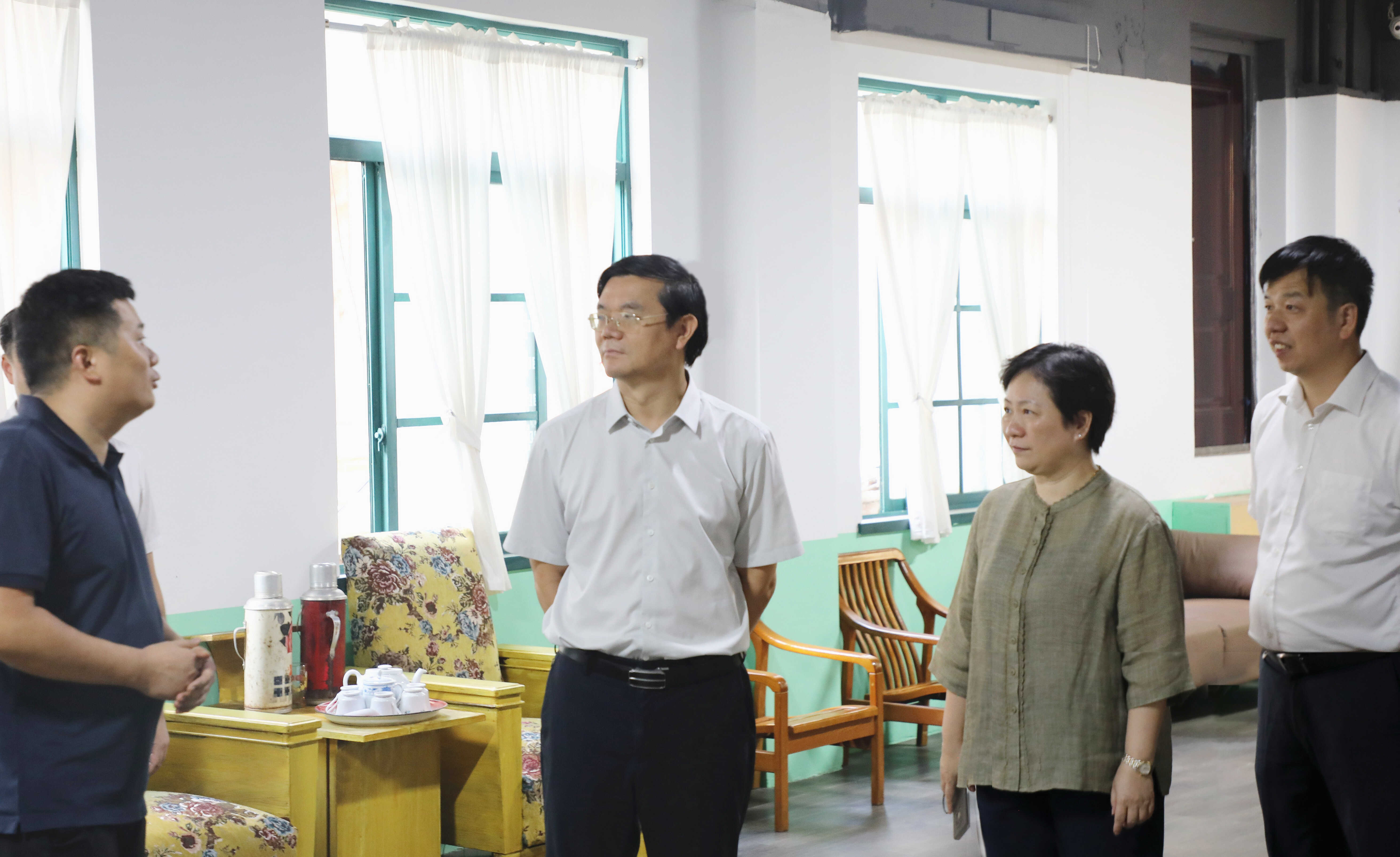 调研组一行在广西电影集团拍摄影棚调研。