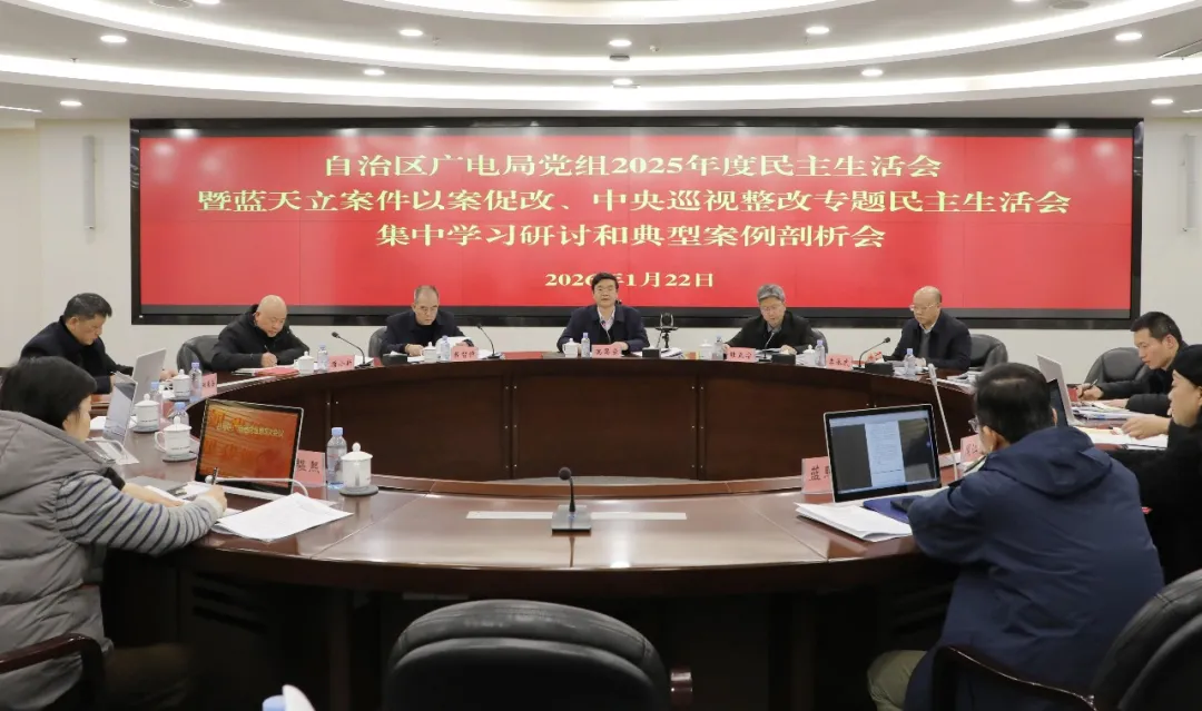 1月22日,自治区广电局党组开展2025年度民主生活会暨蓝天立案件以案促改、中央巡视整改专题民主生活会集中学习研讨和典型案例剖析,深入学习领会习近平总书记关于党的自我革命的重要思想和关于加强党的作风建设的重要论述,传达学习中央、自治区相关会议精神,剖析违反中央八项规定精神典型案例,深化思想认识、找准思想根源,进一步打牢开好民主生活会的思想基础。自治区广电局党组书记、局长满昌学主持并讲话,局党组成员、副局长陆正宁、黄智恒,局一级巡视员李承武参加。