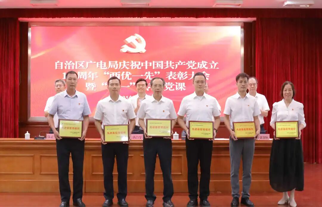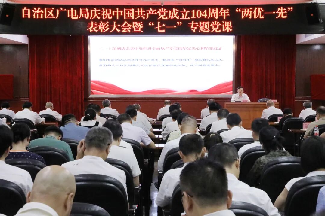 2025年7月1日,自治区广电局举办庆祝中国共产党成立104周年“两优一先”表彰大会暨深入贯彻中央八项规定精神学习教育专题党课,期间宣读了《自治区广电局直属机关党委关于表彰“庆祝中国共产党成立104周年”优秀共产党员、优秀党务工作者、先进基层党组织的决定》,并为受表彰的先进集体和个人代表分别颁发牌匾和荣誉证书。